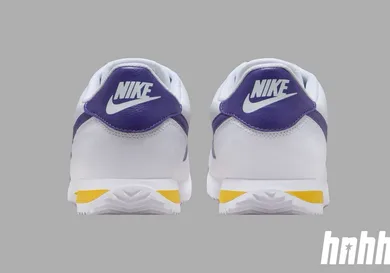 The Nike Cortez will make a splash with its upcoming "Lakers" colorway. This iconic silhouette will now feature a tribute to the legendary basketball team, the Los Angeles Lakers. The sneaker sports a clean white leather upper, providing a timeless and versatile base. Purple and yellow details are prominently displayed, celebrating the Lakers' classic colors. A vibrant purple Swoosh adorns the sides, while yellow accents highlight the heel tab and tongue branding. These bold color pops bring a dynamic and sporty look to the traditional Cortez design.
