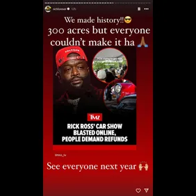 Rick Ross laughed off the backlash to his latest annual car wash, on Sunday night, as fans continued to call for refunds. Over the weekend, Ross painted a picture of the car show as going off without a hitch in various posts on Instagram, but the comments sections have told a different story. Fans have flooded the replies with demands for their money back, calling the event disorganized and claiming they couldn't get inside. Ross appeared to downplay these complaints in a post on his Instagram Story, sharing an article TMZ published covering the situation.