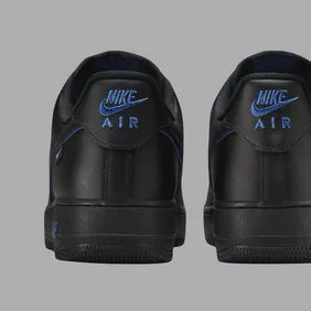 The sneakers feature a dark rubber sole with a white midsole. Also, the upper features a blue leather base with black leather overlays. Further, the Nike Swoosh is found on the sides, in black leather. Black laces and a black heel tab complete the design. Nike branding can be found on both the tongues and heels. Overall, this pair features a clean colorway, combining black and blue tones.
