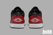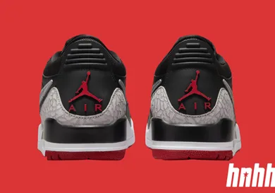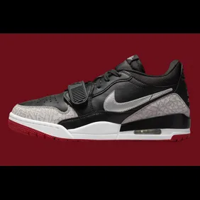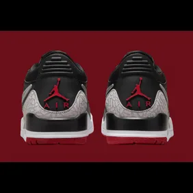 The Air Jordan Legacy 312 Low is about to make waves with its upcoming "Bred" colorway. This sneaker combines classic design elements with modern flair. The pair features a black leather base, providing a sleek and timeless look. Iconic elephant print accents in grey adorn the toe box and heel, adding a touch of classic Jordan style. The black and red color scheme, famously known as "Bred," is instantly recognizable and cherished by sneaker enthusiasts. The red accents appear on the Nike Swoosh, lace loops, and branding, creating a striking contrast against the black leather.
