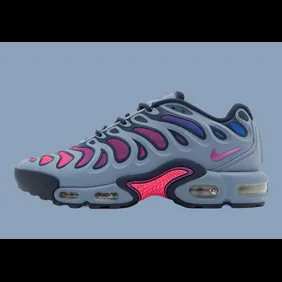 The Nike Air Max Plus Drift is set to release in the new "Ashen Slate" colorway. This edition features a mostly grey look, giving it a sleek and modern appeal. The highlight of this sneaker is the vibrant pink-to-purple gradient mesh underlay, adding a pop of color and dynamic style. The grey overlays provide a clean, streamlined appearance. The gradient mesh underlay contrasts beautifully with the grey, creating a striking visual effect. This combination of colors and materials makes the "Ashen Slate" colorway unique and eye-catching.