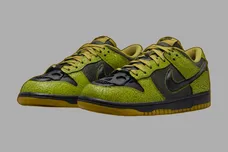 The Nike Dunk Low is gearing up for Halloween with its upcoming "Halloween" colorway, and on-foot photos have been revealed. This release features a black cracked leather base with yellow cracked leather overlays, creating a bold contrast that adds to the eerie, worn look of the design. One standout detail is the black skull graphic on the toebox, perfectly fitting the spooky Halloween theme and giving the sneaker a unique edge. The yellow accents further enhance the shoe's haunting appeal, making it a standout for the spooky season.