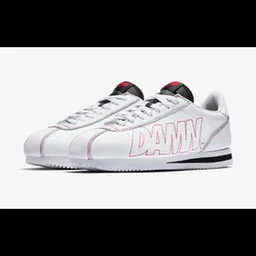 The kicks are built on a white leather upper, accompanied by red and black accents including the "DAMN." text which sits in place of the Nike swoosh. This pair is far different than the first Nike Cortez collab that Kendrick debuted last month- there's still no word on when/if that predominately red colorway will release.