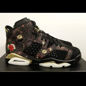The CNY 6s, built on a combination of leather and nubuck, come in a black, multi-color, summit white and metallic gold color scheme, complete with floral embroideries that make them unlike any Air Jordan 6s that have ever released.