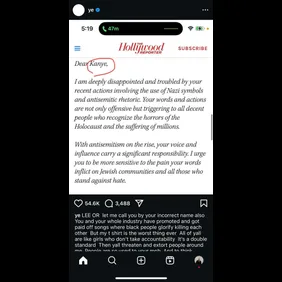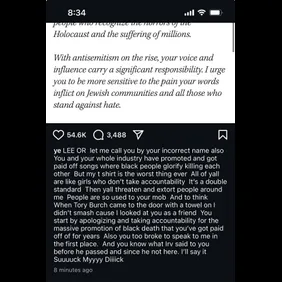 "LEE OR let me call you by your incorrect name also You and your whole industry have promoted and got paid off songs where black people glorify killing each other But my t shirt is the worst thing ever," West wrote. After bringing up an encounter with Tory Burch, he continued: "You start by apologizing and taking accountability for the massive promotion of black death that you’ve got paid off of for years. Also you too broke to speak to me in the first place. And you know what Irv said to you before he passed and since he not here. I’ll say it Suuuuck Myyyy D*ck.”