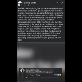 "ODB is a legend, a trailblazer and a true original," Method Man wrote in part in his response over this Ol' Dirty Bastard disrespect. "Don’t you forget it. Word. Not everybody gone get his style because they feel like [assuming] s**t about him. So f**k what you heard. ODB doesn’t have to but if anybody got a problem with me defending a brother/friend you can go f**k off! RIP OBD." We wonder just how different hip-hop would be today if he was still around.