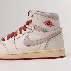 The sneaker features a sail leather upper with distressed suede accents on the collar and Swoosh. The faded red laces complement the deep cinnabar detailing on the Wings logo and outsole. A vintage-inspired midsole enhances the aged aesthetic. Exposed stitching and a deconstructed tongue complete the raw look. The sneaker removes the classic Nike Air branding, making it a unique take on the iconic Jordan 1.