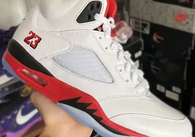 The Air Jordan 5 "Fire Red Black Tongue" brings back an iconic look with a fresh update. Originally introduced in 1990, the Air Jordan 5 was designed by Tinker Hatfield and inspired by World War II fighter jets. Its aggressive midsole design and reflective details became signature elements of the silhouette. Michael Jordan made history in this model, further cementing its status in sneaker culture. This upcoming release stays true to the classic "Fire Red" aesthetic but swaps the usual silver tongue for a bold black one. The crisp white leather upper contrasts against the fiery red midsole, while the black shark teeth detail adds an aggressive edge.