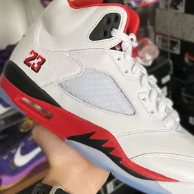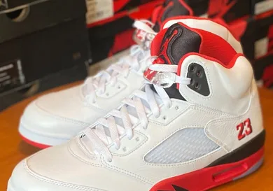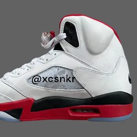 The Air Jordan 5 “Fire Red Black Tongue” makes a bold return, bringing back a legendary look with updated details. This classic colorway, originally worn by Michael Jordan, remains a fan favorite among sneaker collectors. Known for its striking red, black, and white combination, the sneaker pays homage to Jordan's dominance on the court. With its signature design elements intact, this release offers a fresh take on an all-time classic. The Air Jordan 5 first hit the scene in 1990, designed by Tinker Hatfield. Inspired by WWII fighter jets, the shoe introduced a reflective tongue, translucent outsole, and a forward-thinking lace lock system.