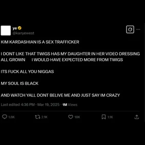 He came and wrote bluntly, "KIM KARDASHIAN IS A SEX TRAFFICKER." Ye then brings FKA twigs into this, calling her out for dressing North West in the music video for their song together, "Childlike Things" off of EUSEXUA, in too "GROWN" fashion. At the same time, he's dragging Kim for allowing this to happen. "I WOULD HAVE EXPECTED MORE FROM TWIGS," he adds, "ITS F*CK ALL YOU N****S MY SOUL IS BLACK AND WATCH YALL DONT BELIEVE ME AND JUST SAY IM CRAZY."