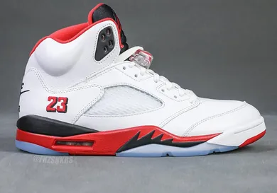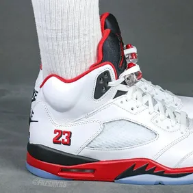 This Air Jordan 5 features a white leather upper with fire red accents throughout. The black tongue adds bold contrast, while red Jumpman branding hits the tongue. An icy translucent outsole completes the look. The classic “23” embroidery returns on the lateral heel. Nike Air branding appears on the heel in black, a nod to the original. Red and black combine on the midsole for a sharp finish.