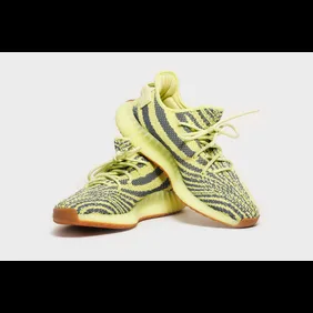 The "Semi-Frozen Yellow" Yeezys, which are allegedly the most limited Yeezy Boost 350 V2, feature a bright yellow primeknit upper with "raw steal" stripes, red accents and a gum outsole. The official colorway is still listed as "Semi Frozen Yellow/Raw Steel/Red."