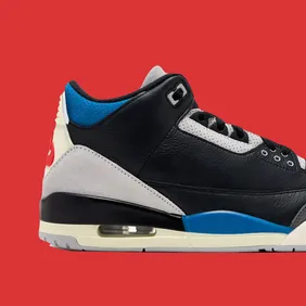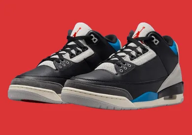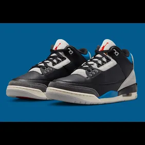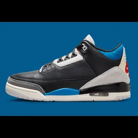 The Air Jordan 3 OG “Rare Air” features a black tumbled leather upper with light grey suede overlays. Bright blue hits land on the collar, while sail tones add a vintage touch to the midsole and heel tab. A bold red Nike Air logo sits on the back. The shoe is finished with a classic white and grey rubber sole.