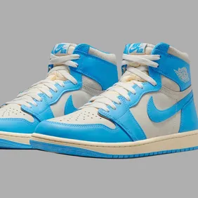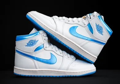 This player exclusive Air Jordan 1 features smooth white leather with metallic university blue hits on the Swoosh, collar, and branding. The classic Wings logo and Nike Air tongue tag return in true 1985 form. A white midsole and bright blue outsole balance the look. Vintage laces and OG packaging details round out the design. A clean and crisp homage to MJ’s UNC days.