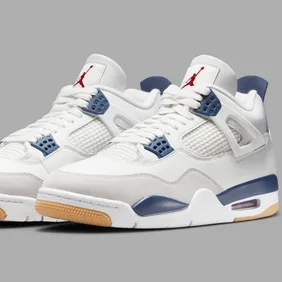 Its sharp design, layered construction, and supportive build make it a perfect base for SB tweaks. The “Navy” colorway follows the successful SB x Jordan 4 formula, featuring skate-friendly materials and subtle color hits. It maintains performance functionality while giving skaters and collectors something fresh. Expect the hype to build as release day nears. Based on the photos provided, the pair features a crisp white leather upper with navy blue overlays. Hints of red appear on the tongue branding, while the gum outsole keeps it skate-ready. The clean SB heel tab completes the crossover look between hoops and street.