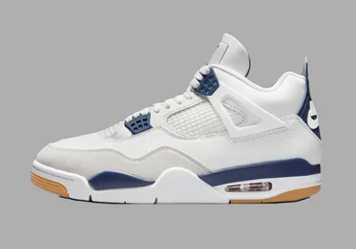 This Nike SB x Air Jordan 4 “Navy” features a premium white leather upper with deep navy accents on the wings, heel, and midsole. A clean gum rubber outsole offers traction for skaters. Red Jumpman branding appears on the tongue, contrasting the navy SB logo on the heel tab. Mesh paneling, padded collars, and durable overlays round out the design, balancing skate functionality and Jordan heritage.