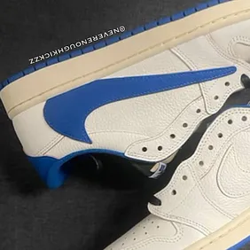The Travis Scott x Fragment x Air Jordan 1 Low OG features a white tumbled leather base with royal blue overlays. Also, a reversed Swoosh appears on the lateral side. Fragment’s lightning bolt and Cactus Jack logos hit the heel. Further, the vintage-look midsole sits atop a blue rubber outsole. Details like exposed foam and red stitching on the tongue finish the look.