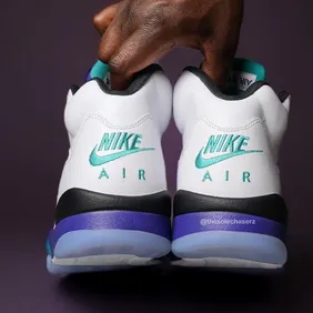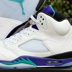 The Air Jordan 5 OG "Grape" features a white leather base with purple midsoles and teal shark teeth details. The black tongue liner adds contrast, while icy translucent outsoles complete the classic look. Further, teal Jumpman logos on the tongues and heels stay true to the original styling.