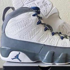 This version of the Air Jordan 9 features a white leather upper with flint grey nubuck overlays. French blue accents hit the branding, eyelets, and heel tab. A grey midsole and white outsole complete the base, while the tongue and inner lining stick to a classic two-tone setup. The sneaker keeps its signature speed-lacing system and globe-inspired detailing for a mix of heritage and style.
