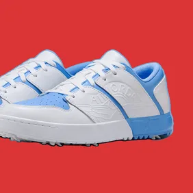 The Rev Golf silhouette leans into comfort, featuring a laceless BOA-style tightening system. It’s sleek, easy to wear, and clearly engineered with both sport and style in mind. In the images, the clean white upper sits above a spiked outsole in University Blue. A textured blue midfoot strap replaces traditional laces, creating a bold visual shift from classic golf silhouettes. The Jumpman logo remains prominent, while small details like the heel tabs and inner liners add to the functional design. As Jordan Brand continues to innovate in the golf space, the Air Rev Golf silhouette may become a fan favorite.
