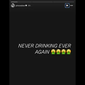 Princess Love is swearing off alcohol following a wild night out which seemingly included reuniting with her estranged husband, Ray J. “Never drinking ever again,” she posted in all caps on her Instagram Story with several vomiting emojis. In a follow-up, she further added: “Never mix tequila and Titos.” The couple is currently in the process of their fourth divorce proceeding.