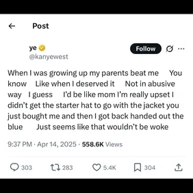 That's when he revealed how he was hit as a kid. "When I was growing up my parents beat me. You know Like when I deserved it. Not in abusive way," Ye said. "I guess I’d be like mom I’m really upset I didn’t get the starter hat to go with the jacket you just bought me and then I got back handed out the blue. Just seems like that wouldn’t be woke."
