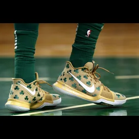 The Celtics inspired Kyrie 3s feature a tan construction with an all-over shamrock print, which he wore to start the game before swapping them out for a more subtle, white and red colorway.
