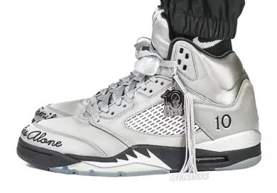 The women’s Air Jordan 5 Wings features a metallic silver upper with tonal mesh panels and reflective detailing. Further, the toe box carries embroidered script that reads “In This Family No One Flies Alone.”