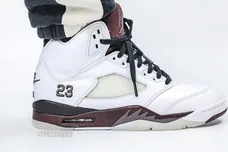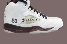 The heel showcases embroidered Nike Air branding, while the number 23 appears stitched in tonal hues. Semi-translucent mesh panels cover the sides, offering classic AJ5 design cues. An aged translucent outsole rounds out the vintage-inspired finish.