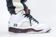 A Ma Maniere is no stranger to elevated storytelling through footwear. Their projects with Jordan have consistently merged premium materials, subdued tones, and powerful narratives. This latest take on the Air Jordan 5 keeps that trend alive, dressing the shoe in a crisp white upper accented by deep violet hits across the midsole, tongue, and liner.