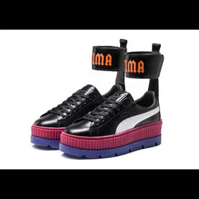 Today, new colorways of the Puma Fenty "Ankle Strap" sneaker were revealed, including black/magenta/purple, black/white, and a monochromatic cream rendition. Each of the kicks will reportedly retail for $180 and will be available at select Puma retailers including Puma.com and SneakersnStuff.com.