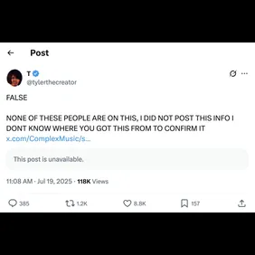 "FALSE," he wrote. "NONE OF THESE PEOPLE ARE ON THIS, I DID NOT POST THIS INFO I DONT KNOW WHERE YOU GOT THIS FROM TO CONFIRM IT." Complex Music has since deleted the fake tracklist, although it continues to circulate online.