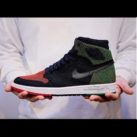 The kicks feature the beloved flyknit construction throughout the upper, including red on the toebox, green around the heel and black everywhere else. A black leather swoosh, black waxed laces, a white midsole and tri-colored outsole complete the look on the 2018 "BHM" Air Jordan 1 Flyknit.