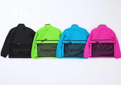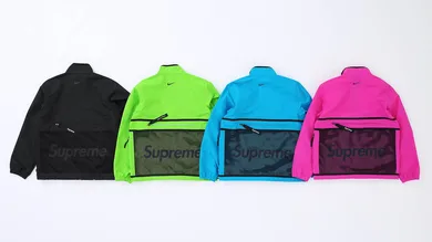 Also in bold neon swatches, the line offers jackets, pants and running caps. Following some of the same functions as the shoes, the clothing boasts nylon and water-resistant material, mesh pockets, and reflective graphics. When the shoes first dropped, it was assumed they were more for the athletic demographics of the brands combined, with technical aspects such as an Air-Sole® heel unit and Zoom Air™ forefront added to the sneakers. With the introduction of the clothing, a streetwear aesthetic has come into place making the collaboration open to all lovers of Supreme and Nike, respectively.