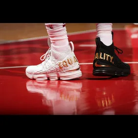LeBron laced up one white shoe and one black shoe, both of which had "Equality" stamped on the heel in gold, similar to the black pair he wore at the beginning of the season.