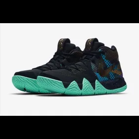 The "Mamba Mentality" Nike Kyrie 4 is built on a black upper accompanied by a colorful, eye-catching graphic that draws on inspiration from the Kobe 5 “Prelude” including the sneaker's mint outsole, as well as a purple heel clip with Irving's "all-seeing eye" logo.