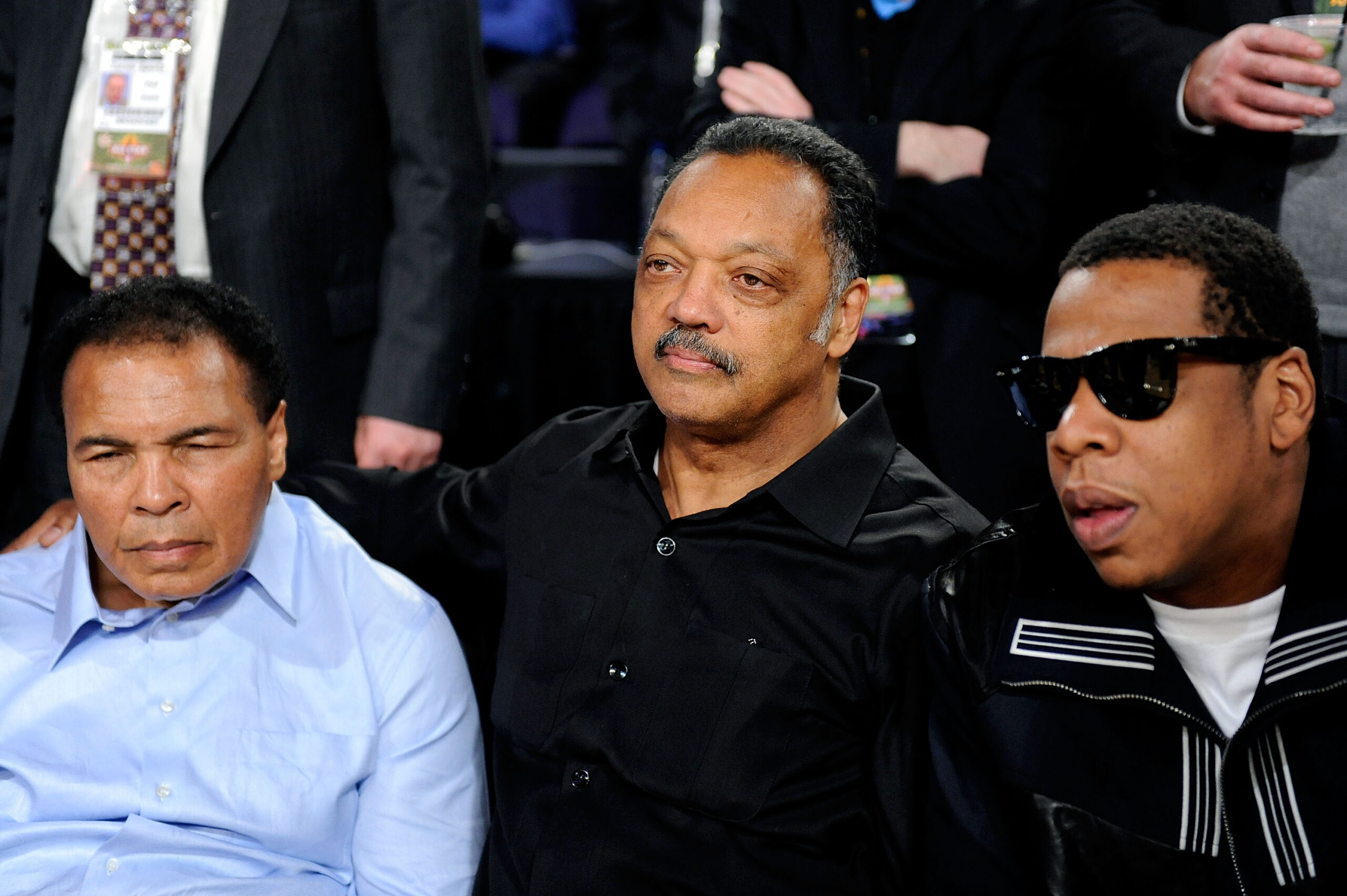PHOENIX – FEBRUARY 15: (L-R) Muhammed Ali, Jesse Jackson and Jay-Z attend the 58th NBA All-Star Game, part of 2009 NBA All-Star Weekend at US Airways Center on February 15, 2009 in Phoenix, Arizona. NOTE TO USER: User expressly acknowledges and agrees that, by downloading and or using this photograph, User is consenting to the terms and conditions of the Getty Images License Agreement. (Photo by Kevork Djansezian/Getty Images)